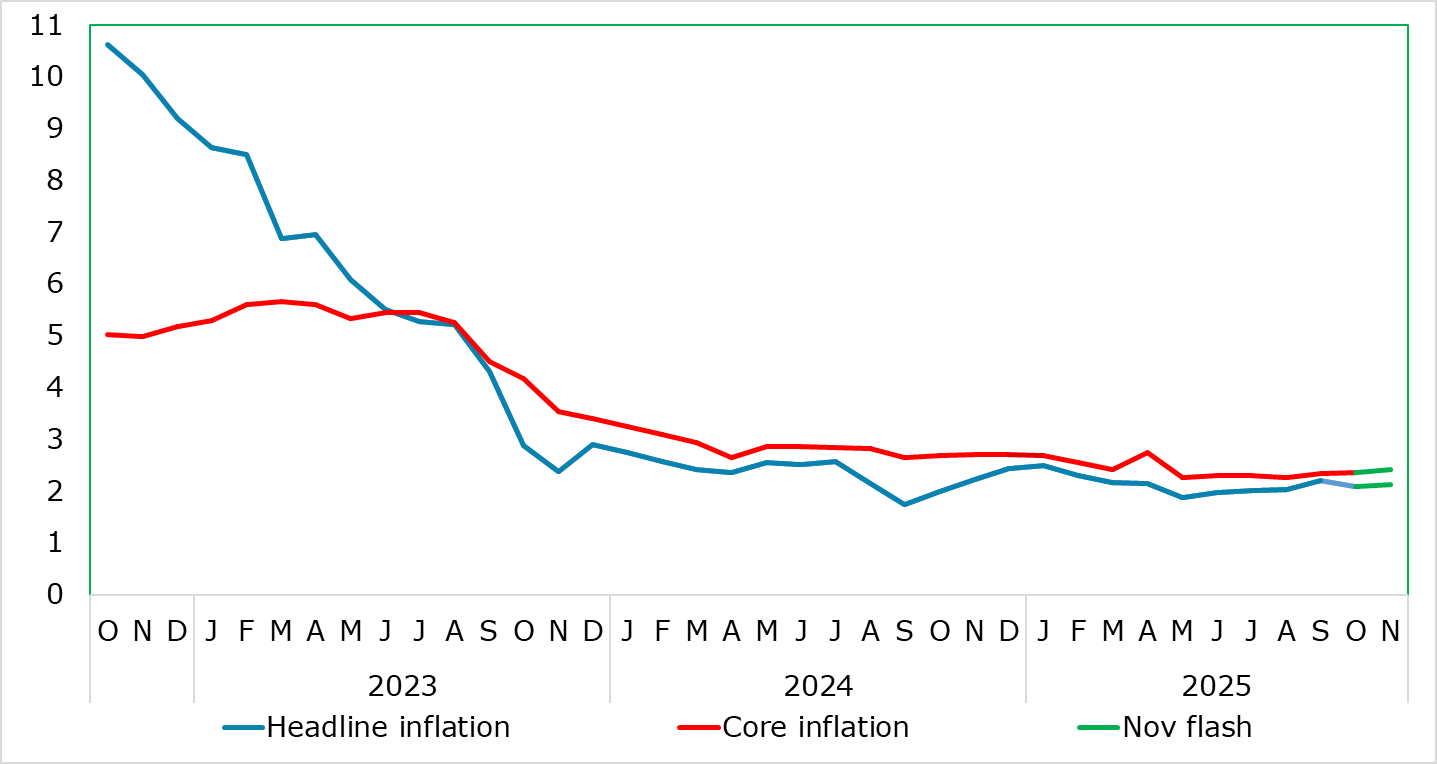With what were previously unfavourable energy-related base effects reversing, EZ inflation edged down 0.1 ppt to 2.1% in October, largely in line with consensus thinking, but with the main core rate stable at 2.4%. This reversed in the flash November numbers in what was an outcome a notch above both consensus and probably ECB expectations. But the diehard hawks at the ECB will focus on the small further rise in services inflation to a seven month high of 3.5%, a shift higher echoed by less favourable, but still target-consistent, adjusted m/m data. Even so, core inflation stayed at 2.4% (Figure 2) still supporting an ECB view for core inflation staying below 2% out to 2027 is very plausible. Thus is backed up also by (much softer) wage data which also very much suggest that the pick-up in services inflation is spurious and where more abundant labor supply is evident (Figure 3)!