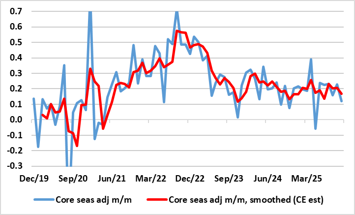 As a result, this trend and noise could bring the headline and core rate are seen dipping below 2% this month with base effects pulling the headline down toward 1.5% in Q1, especially if demand weakness starts to accentuate what have largely been supply factors driving the disinflation process hitherto. Notably, as recent calendar distortions unwind, what has looked like fresh price pressures in seasonally adjusted short-term m/m movements for core had reversed and are consistent with on-target inflation (Figure 2), albeit with some fresh further spikes in adjusted services numbers!