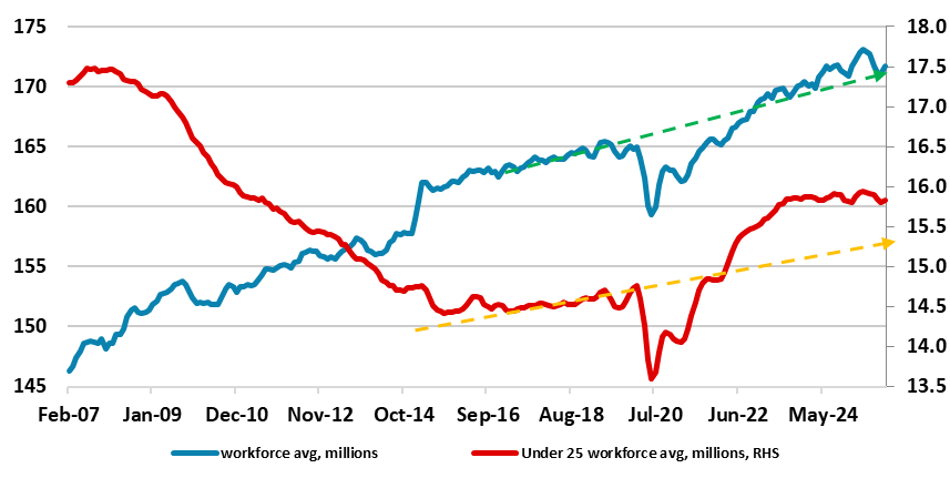 In contrast to food inflation in neighbouring economies (at least until recently), that for the EZ seems under control, actually slipping back further in October and staying at 2.5% last month despite some adverse weather of late. Admittedly, services inflation, at 3.5% moved up further but from an August reading that was the lowest since March 2022 but despite this rise, it still seems to be belatedly following in the footsteps of lower wage pressures. Moreover, labor market data released today alongside that are showing a still clear rising workforce (Figure 3) may explain such weaker cost pressures.