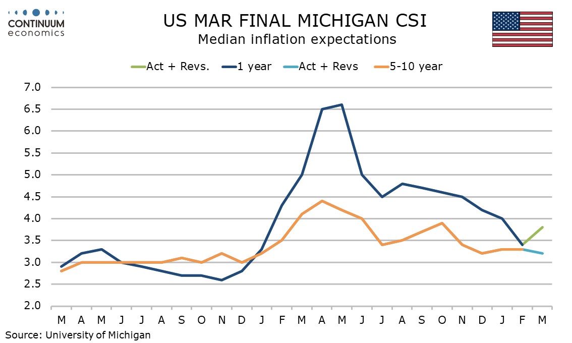 The 5-10 year view on inflation however is unrevised at the preliminary view of 3.2%, still below the 3.3% seen in January and February. The energy shock is not seen causing a sustained boost to inflation.