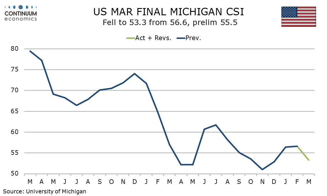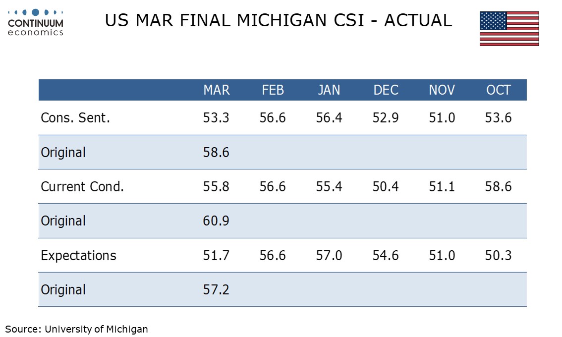 The final March Michigan CSI at 53.3 is weaker than the preliminary of 55.5 which appears to be a response to worries over the Middle East and energy prices. The 1 year inflation expectation has been revised up significantly, but the Fed will be relieved to see the 5-10 year view unchanged.