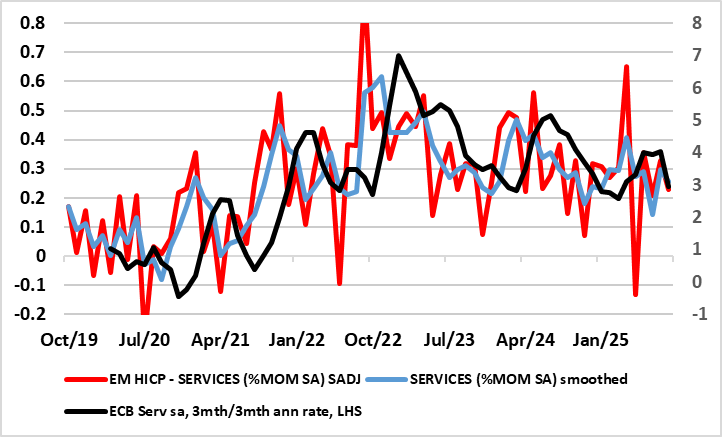 This concern is the main rationale for the further conventional policy easing we anticipate. But the ECB debate may continue to focus excessively on the intricacies of medium-term inflation projection, however, spurious they may be. This mindset will not be altered by the final HICP data for September even given the further but largely as-expected 0.2 ppt rise in the headline to 2.2%, not least as this still implies that the ECB’s Q3 projection for both the overall and core figures in Q3 were met. This rise in the headline was again food and (largely) energy base effect driven but also with services, almost solely due to travel related base effects. But highlighting still soft core inflation, adjusted m/m data (Figure 2) still show reassuring signs even in regard to apparently resilience services.