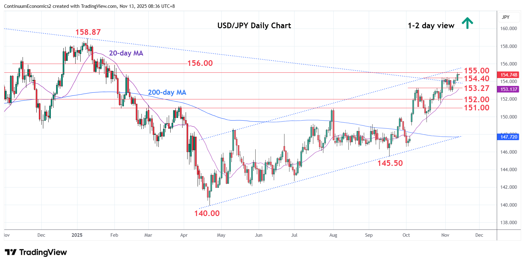 00:45 GMT - Consolidation below the 154.40/48 highs has given way to break to extend gains within the rising channel from the April low to reach resistance at the 154.80/155.00 area. Higher will see room to 155.50 channel resistance and the 156.00 level. However, overbought daily and weekly studies caution corrective pullback. Meanwhile, support is raised to the 154.40/00 area which is expected to underpin. Break here will open up room for deeper pullback to the strong support at 153.27/153.00, 10 October high and congestion area.