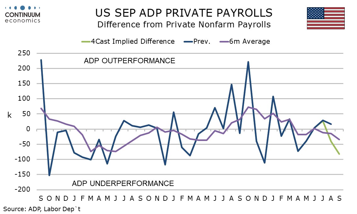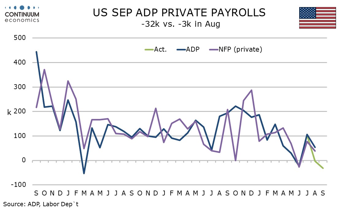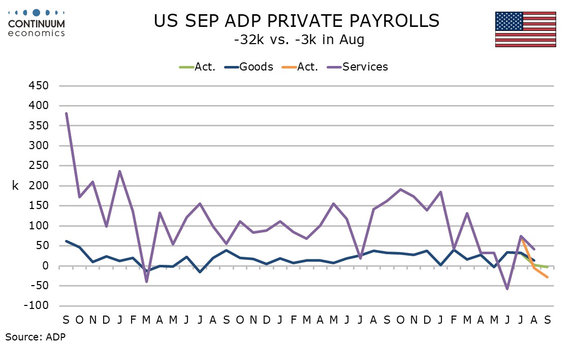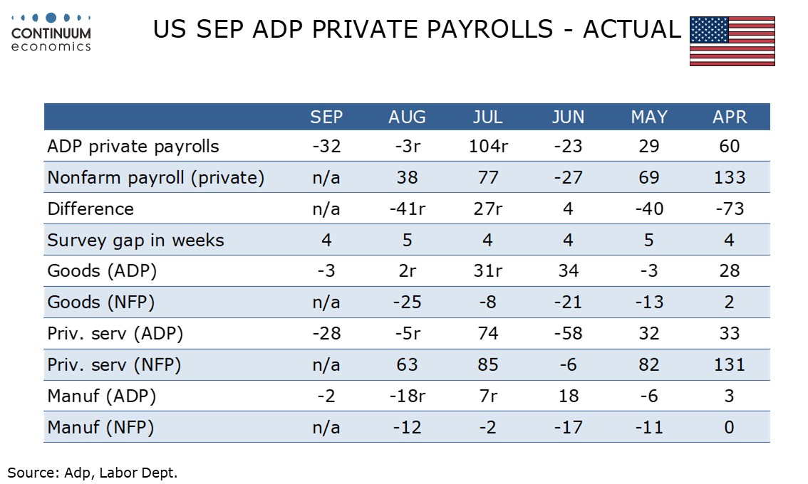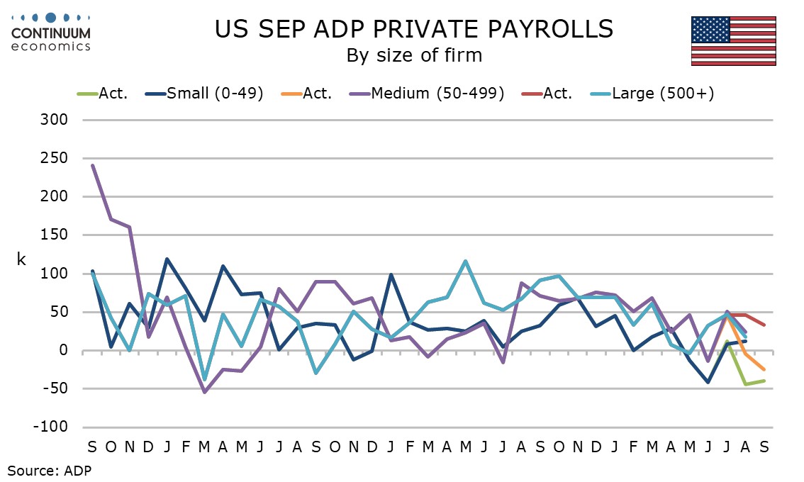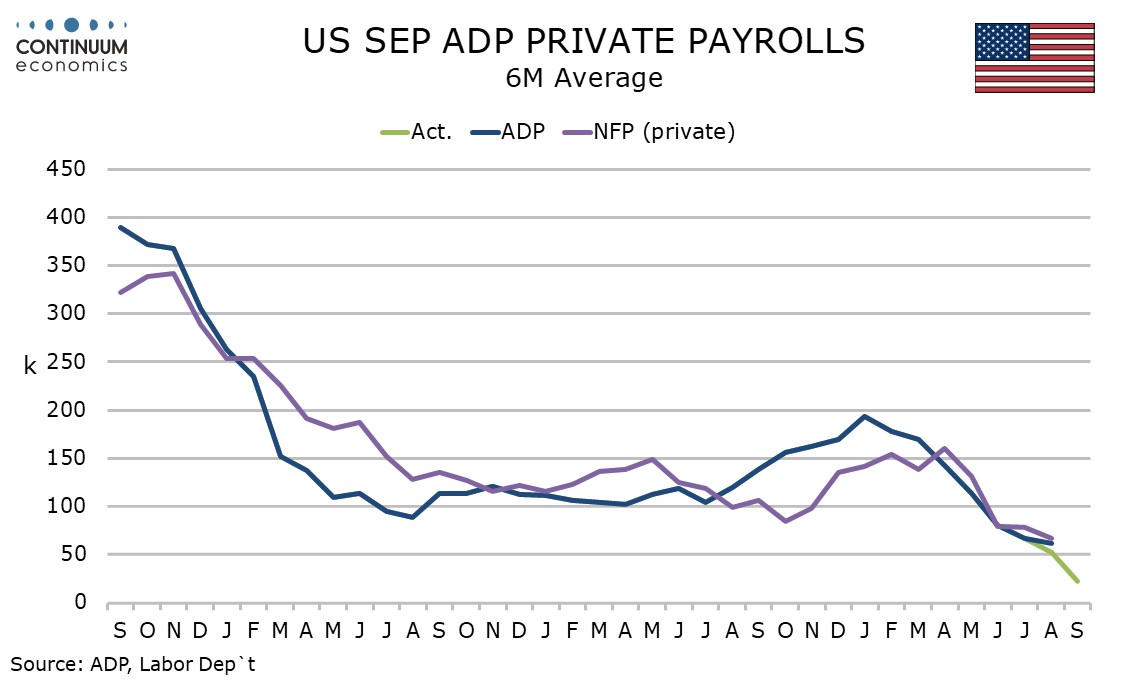 September’s ADP detail looks broadly weak outside a 33k increase in education and health, a sector that has provided the bulk of recent non-farm payroll growth but has tended to underperform in the ADP data. Leisure and hospitality, a sector that has shown some recent volatility, was weak in this ADP report, falling by 19k. Manufacturing and construction saw modest declines of 2k and 5k respectively.