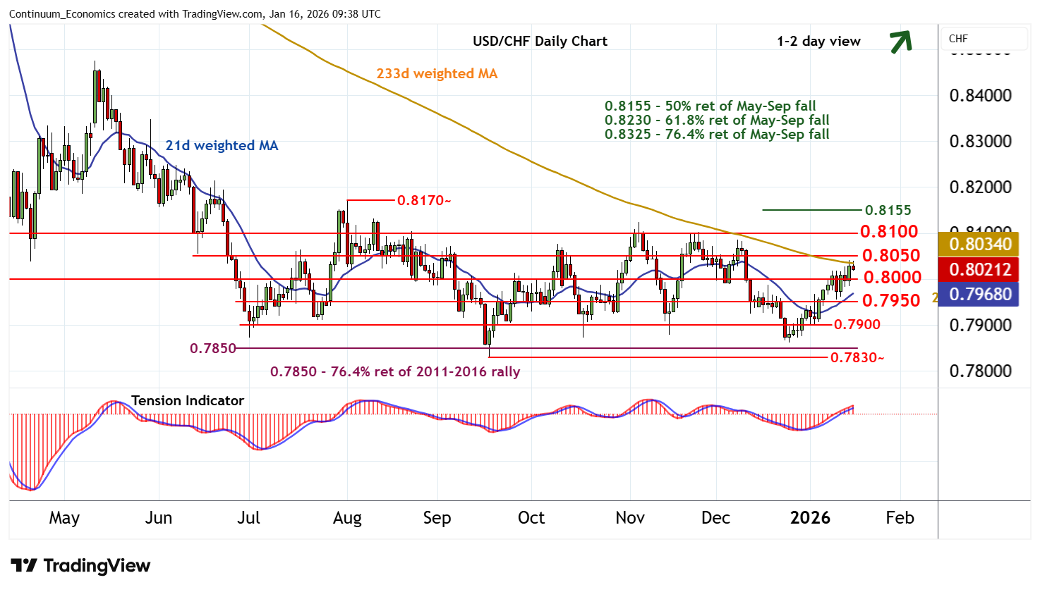 09:30 GMT - Choppy trade has given way to a test higher, with prices reaching 0.8040 before settling lower as overbought intraday studies unwind. The daily Tension Indicator is rising, highlighting room for a fresh test higher. But flat overbought daily stochastics are expected to limit initial scope in renewed consolidation beneath resistance at 0.8050, before rising weekly charts prompt a break and extend late-December gains towards 0.8100. Meanwhile, a close back below 0.8000 would turn sentiment neutral once again and prompt consolidation above 0.7950.