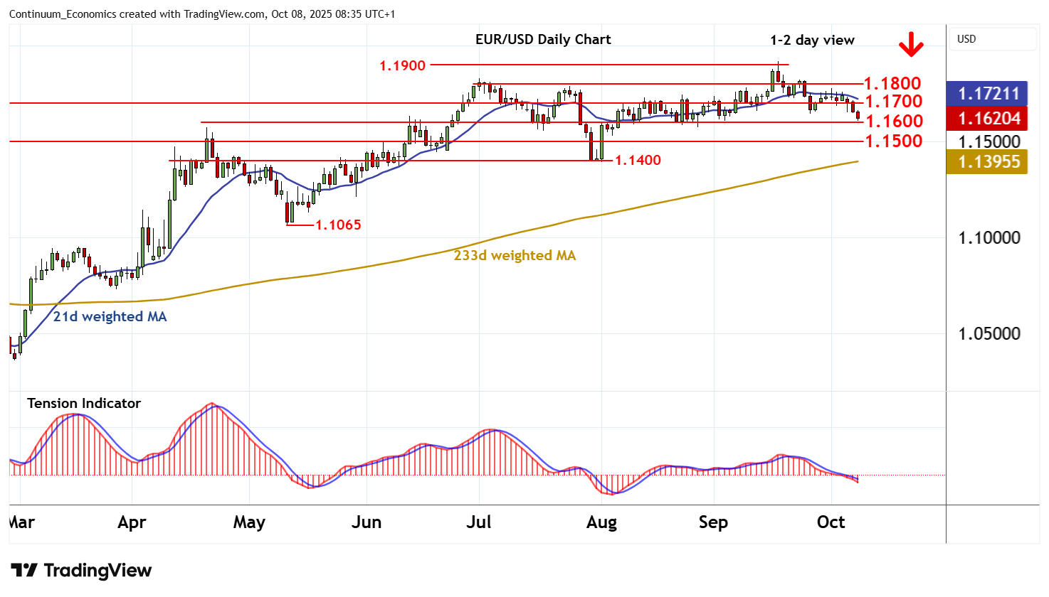 08:30 BST - Anticipated losses are meeting buying interest just above congestion support at 1.1600, with prices currently trading around 1.1620. Both intraday and daily studies are under pressure, however, and broader weekly charts are also negative, highlighting room for further losses in the coming sessions. A break below 1.1600 will add weight to already bearish price action, and extend mid-September losses initially towards further congestion around 1.1500. Already oversold daily stochastics could limit any initial tests in renewed consolidation. Meanwhile, resistance remains at congestion around 1.1700. A close above here, if seen, would help to stabilise price action and prompt consolidation beneath 1.1800.