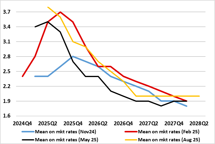 In fact, the MPC majority may now be getting more sensitive about the real economy and labor market backdrop, not least helped by what have been softer than expected CPI and wage numbers. The latter look all the more notable as they chime very much with the BoE’s own survey data regarding slack in the labor market and the likely impact of wage pressures (Figure 1). And of course the fiscal picture is getting potentially more onerous, with spending cuts and tax rises looming, both more sizeable and earlier than hitherto considered – the question here is whether eh MPC will wish to see details of the Nov 24 Budget and incorporate them into an updated outlook in December or instead anticipate and act sooner on the presumption that the existing on-target inflation projection (Figure 2) will be will be reduced back to those seen prior to August.