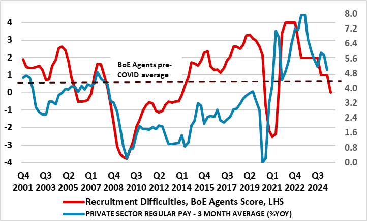 The BoE is keen to stress that the restrictiveness of monetary policy has fallen as Bank Rate has been reduced. However, until most recently, the MPC majority has hinted that the recent regular pace of easing seen so far in the cycle may be slowed or paused amid price persistence concerns, this reflecting the MPC majority’s complacency regarding what we think is a rapidly (not gradually) deteriorating labor market that warrants the further circa-75 bp of rate cuts we have pencilled in into H1 next year. The BoE view is that the ratio of vacancies to unemployment had continued to fall below Bank staff’s estimate of its equilibrium level. But its own (agents) survey data suggest that this has occurred faster and more clearly that (far from authoritative) ONS official labor market data), this also backed up by BoE survey data regarding employment that chime with the clear y/y falls seen in now fully accredited HMRC payroll figures.