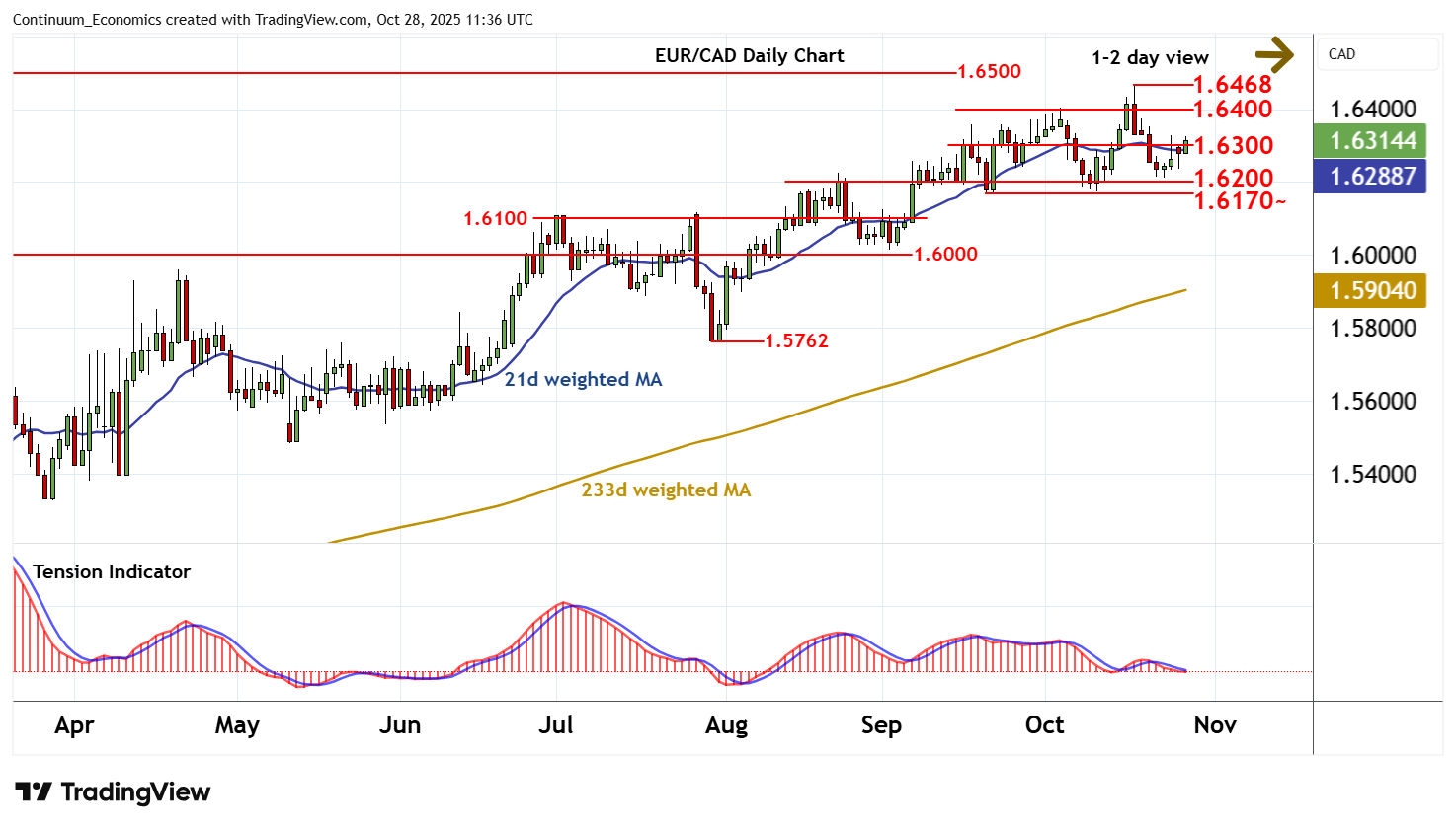 11:25 GMT - Consolidation has given way to a fresh test higher, with the break above 1.6300 currently balanced around 1.6315. Rising intraday studies and improving daily readings highlight room for further tests higher in the coming sessions. But negative weekly charts are expected to limit scope in renewed selling interest beneath resistance at 1.6400. Following cautious trade, fresh losses are looked for. A break back below congestion support at 1.6300 will open up stronger support at the 1.6170~ weekly lows from mid-September to mid-October, and congestion around 1.6200. A further close beneath here would add weight to sentiment and confirm a near-term top in place at the 1.6468 current year high of 17 October, as deeper losses then focus on 1.6100/15.