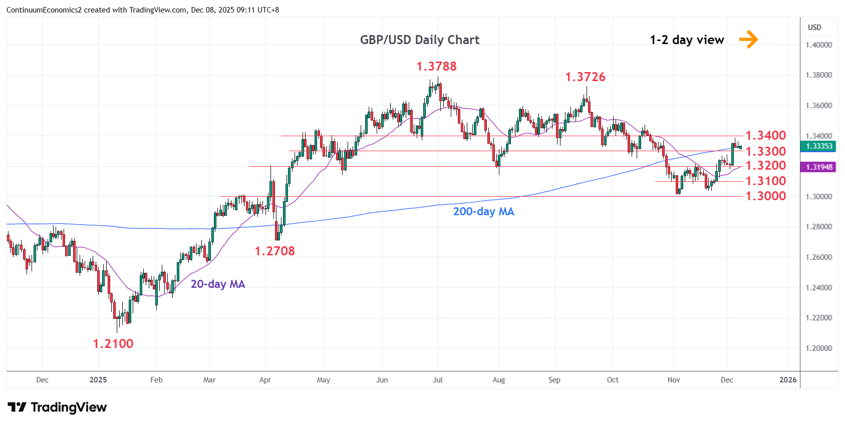 01:15 GMT - Settled back from the 1.3385 high as prices unwind overbought intraday and daily studies and consolidate gains from the November lows. However, positive weekly studies suggest consolidation giving way to renewed buying interest later to further retrace the September/November losses. Above the 1.3385 high and 1.3400 congestion will open up room for extension to the 1.3471 resistance then the strong resistance at the 1.3500/27 area. Meanwhile, support is raised to the 1.3300/1.3275 area which should underpin and sustains gains from the 1.3038/10, November lows.
