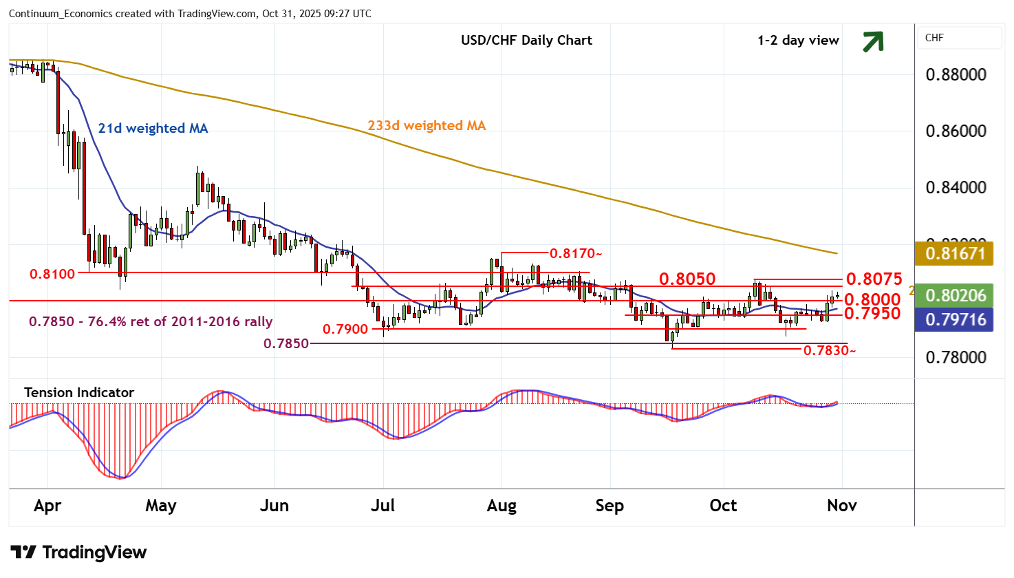 09:20 GMT - The anticipated break back above 0.8000 has reached 0.8035, where unwinding overbought intraday studies are prompting fresh consolidation. Daily readings continue to rise and broader weekly charts are also improving, highlighting room for further strength in the coming sessions. Resistance is at the 0.8050 break level and extends to the 0.8075 weekly high of 9 October. But by-then overbought daily stochastics should limit any initial tests in consolidation. Meanwhile, support is raised to congestion around 0.8000. A close beneath here will turn sentiment neutral and give way to consolidation above 0.7950.