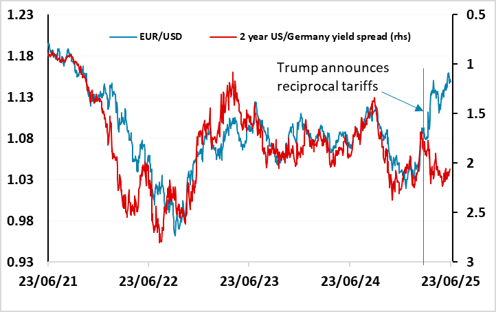 As figure 1 shows, EUR/USD had been well behaved in recent years, sticking closely to the 2 year yield spread, until Trump announced reciprocal tariffs at the beginning of April. After that, the USD fell back in general but particularly against the EUR even though yield spreads have moved little since the announcement. The EUR has also been helped by some increase in Eurozone growth expectations due to the promise of increased defence and infrastructure spending, particularly in Germany. But the divergence from the yield spread relationship reflects a general loss of confidence in the theme of US exceptionalism that has supported US equities and the USD in recent years. Fund managers are reportedly reducing their exposure to the US, and if this continues there is scope for the USD to continue to weaken as it did during the first Trump presidency.