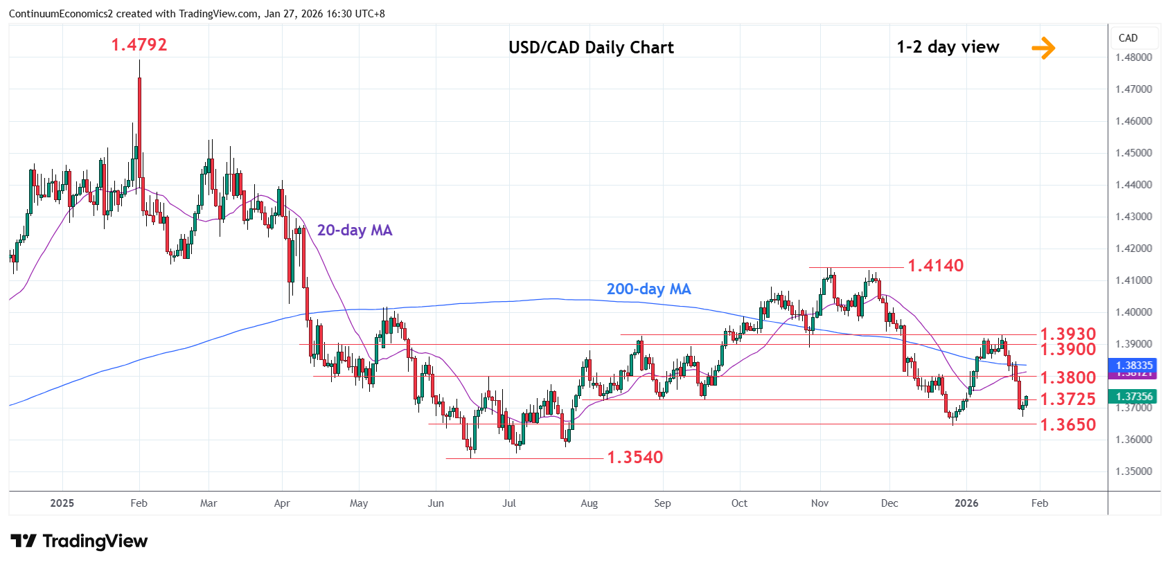 08:35 GMT - Bounce from the 1.3670 low to regain the 1.3700 level see prices unwinding oversold intraday studies. Negative daily studies are stretched as well and suggest scope for bounce to correct losses from the 1.3930 high of last week. Above the 1.3700/25 area see room for stronger bounce to resistance at the 1.3750/1.3800 congestion area which is expected to cap. Meanwhile, support is raised to the 1.3700 level. Would take break here to expose the 1.3670/40 lows to retest. Below these will return focus to the 1.3575/40, July and June 2025 year lows.
