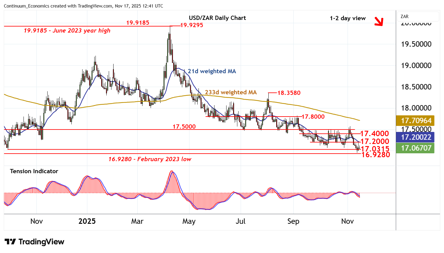 12:25 GMT - The anticipated break below the 17.0315 year low of 30 September 2024 has bounced from the 16.9495 current year low of 13 November, as intraday studies turn higher, with prices currently balanced in choppy trade above 17.0000. Oversold daily stochastics are unwinding, suggesting room for a minor test higher. But the falling daily Tension Indicator and deteriorating weekly charts are expected to limit any fresh gains in renewed selling interest beneath congestion resistance at 17.2000. Following cautious trade, lower levels are looked for. A later close below 17.0000 will add weight to sentiment and extend May 2023 losses below the 16.9280 low of February 2023 towards the 16.6900 year low of January 2023.
