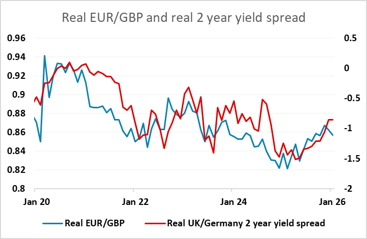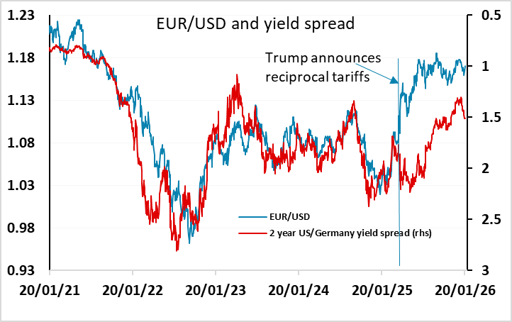The general market tone will depend on any developments in the Greenland saga. The USD was under general pressure on Tuesday, reprising the behaviour seen when Trump announced reciprocal tariffs in April last year. Then, EUR/USD gained 7 figures in three weeks despite rising US yields and widening yield spreads in the USD’s favour. Since then, spreads have moved back in favour of the EUR, and the outperformance of the historic yield spread relationship is now quite modest. The reaction to the Greenland tariff threat has so far been more modest, in part because many doubt that the tariffs will be imposed, in part because equity declines have been milder. However, unless some solution emerges it is hard to see equities recovering before the tariffs are imposed on February 1, and the USD can be expected to remain under pressure.