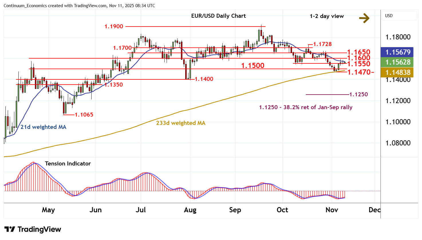 08:30 GMT - Little change, as mixed intraday studies keep near-term sentiment cautious and extend consolidation above support at the 1.1550 break level. Daily readings continue to rise and oversold weekly stochastics are flattening, highlighting room for a test of congestion resistance at 1.1600. But the negative weekly Tension Indicator should limit any immediate break in renewed selling interest/consolidation beneath further congestion around 1.1650. Meanwhile, a close below 1.1550 will turn sentiment neutral and prompt consolidation above strong support within congestion around 1.1500 and the 1.1470~ low of 5 November.