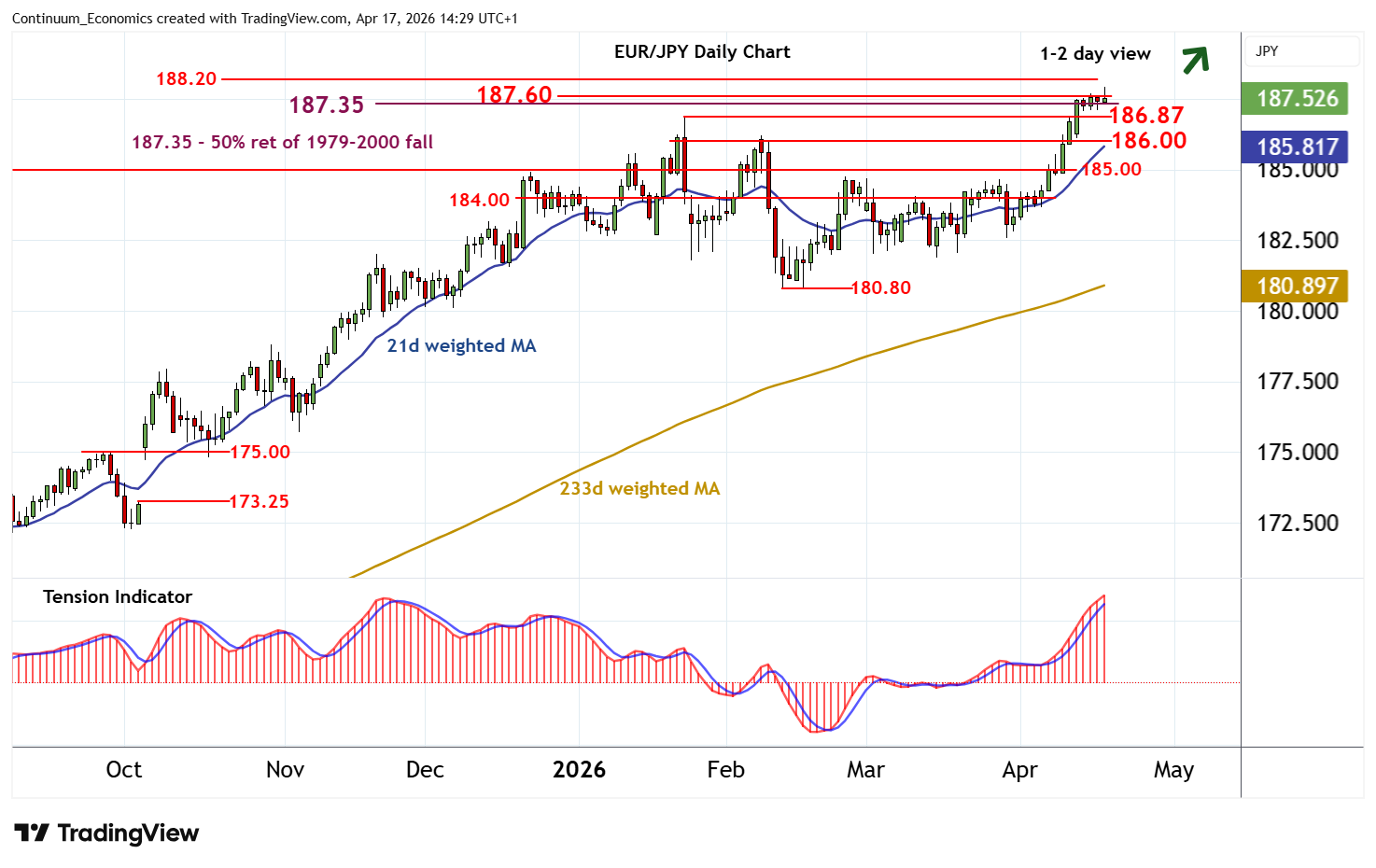 14:15 BST - Consolidation within strong resistance at the 187.35 multi-decade Fibonacci retracement and the 187.60 high of August 1990 has given way to a spike to a fresh year high at 187.95, before falling back to trade around 187.50. Intraday studies are under pressure, highlighting room for a pullback. But mixed/positive daily readings and improving weekly charts should limit scope in renewed buying interest towards the 186.87 monthly high of 23 January. A close beneath here, however, will turn sentiment neutral and give way to consolidation above congestion support at 186.00. Following cautious trade, fresh gains are looked for. Critical resistance is up to the 188.20~ multi-year high of May 1990. A close above here would improve sentiment and confirm continuation of long-term gains.