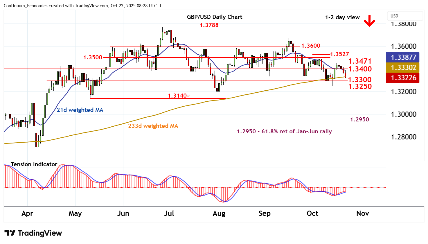 08:10 BST - Cautious trade has given way to a sharp fall, with focus turning to congestion support at 1.3300. Intraday studies are bearish and daily readings have also turned down, highlighting room for a break beneath here towards further congestion around 1.3250. Broader weekly charts are also deteriorating, suggesting extension beneath here and continuation of mid-September losses towards further congestion around 1.3200. Meanwhile, resistance remains at congestion around 1.3400. A close above here, if seen, would help to stabilise price action and give way to consolidation beneath the 1.3471 weekly high of 17 October.