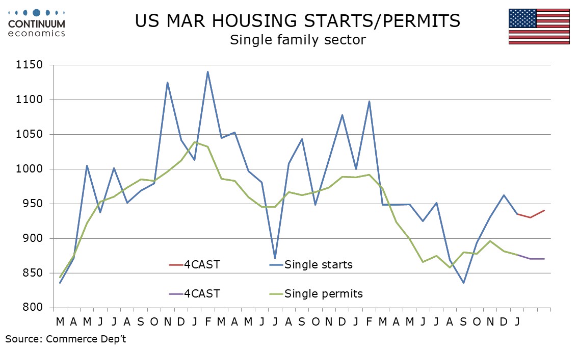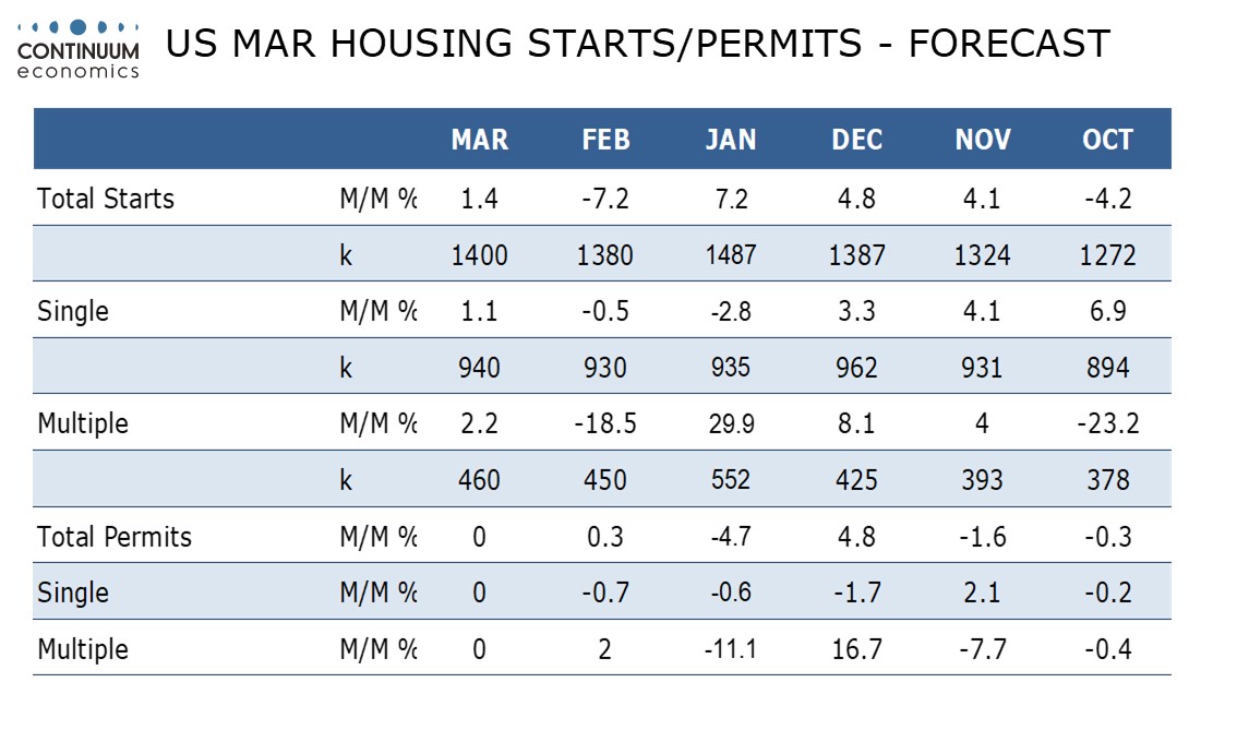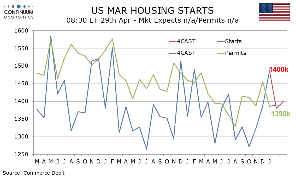 Housing starts and permits data for both February and March will be released on April 29. We expect a fairly flat housing market picture to emerge, with starts falling by 7.2% in February to 1380k after a 7.2% January increase, followed by a 1.4% rise to 1400k in March. We expect permits to rise by 0.3% in February to 1390k, and to remain at that level in March.