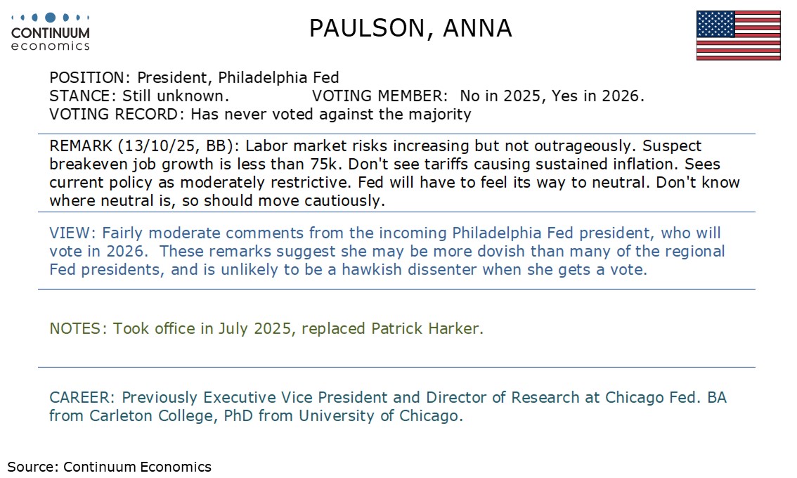 Early comments from incoming Philadelphia Fed President Anna Paulson are moderate in tone.