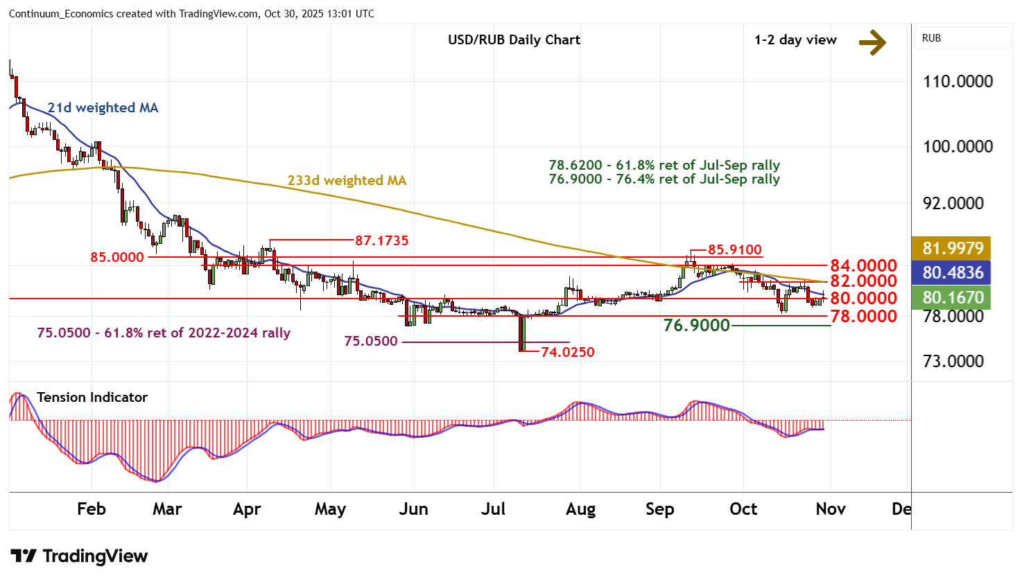 12:55 GMT - Little change, as prices extend cautious trade around congestion resistance at 80.0000. Daily readings have ticked higher, highlighting room for a test above here. But negative weekly charts should limit scope in renewed selling interest/consolidation beneath further congestion around 82.0000. Following cautious trade, fresh losses are looked for. However, a close below congestion support at 78.0000 is needed to turn sentiment negative and extend September losses initially towards the 76.9000 Fibonacci retracement.