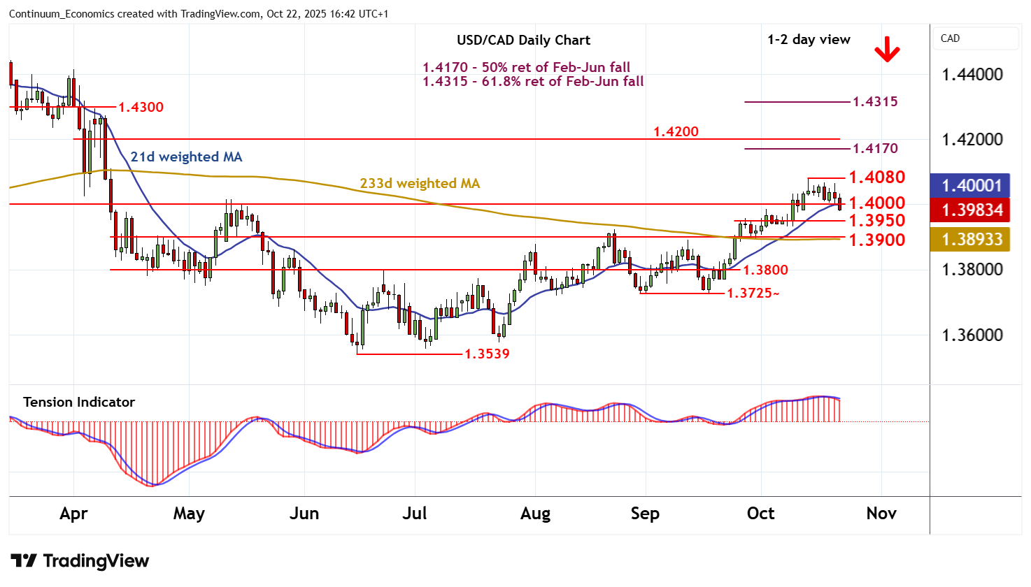 16:10 BST - Cautious trade above 1.4000 has given way to the anticipated break, with prices currently trading around 1.3980. Daily readings are negative and overbought weekly stochastics are turning down, highlighting room for deeper losses in the coming sessions. Focus is turning to 1.3950, with a break beneath here opening up 1.3900. However, the rising weekly Tension Indicator is expected to limit any initial tests of here in fresh consolidation. Meanwhile, a close back above 1.4000 would help to stabilise price action and prompt consolidation beneath the 1.4080 weekly high of 14 October.