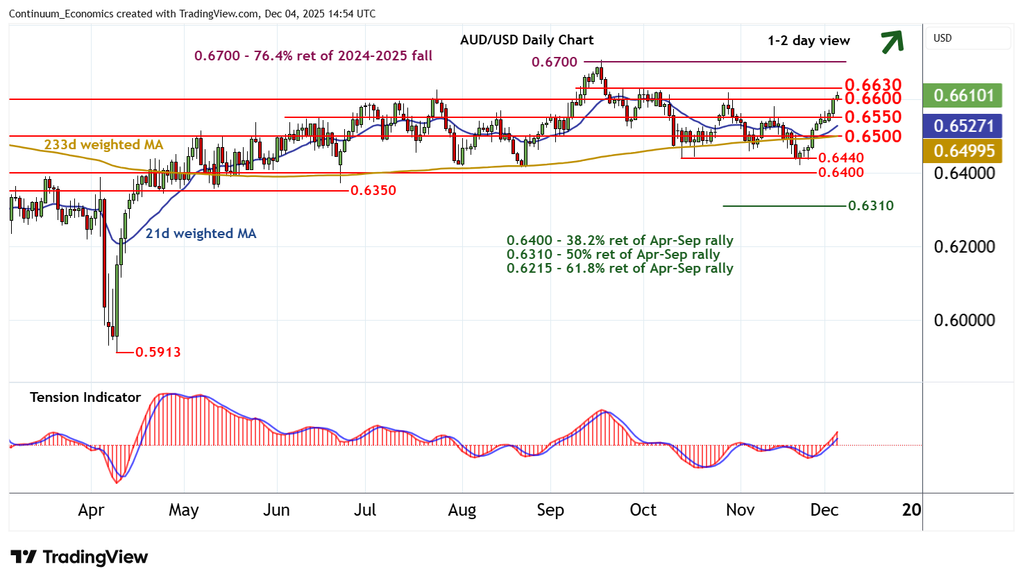 14:45 GMT - Steady gains have reached strong resistance within 0.6600/30, where unwinding overbought intraday studies are prompting short-term reactions. A minor pullback is possible, but mixed/positive weekly charts and improving longer-term readings are expected to limit any losses in renewed buying interest above congestion support at 0.6550. Following cautious trade, fresh gains are looked for. A break above resistance at 0.6630 will improve price action and open up a test of critical resistance at 0.6700/05.