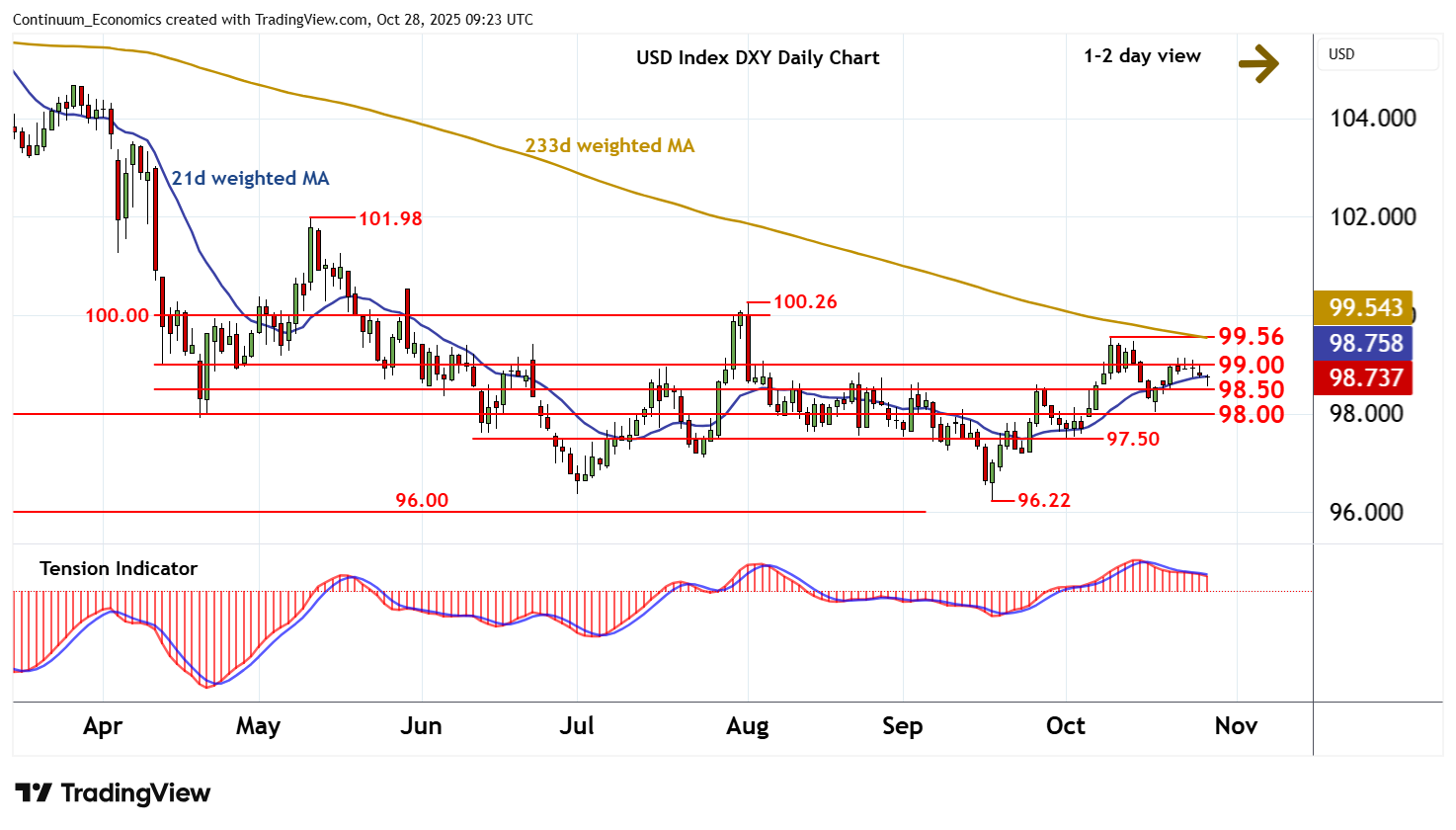 09:10 GMT - Anticipated losses are meeting support just above congestion support at 98.50, as oversold intraday studies flatten, with prices currently balanced around 98.70. Daily readings continue to track lower and overbought weekly stochastics are turning down, highlighting room for further losses in the coming sessions. A break below 98.50 will add weight to sentiment and open up congestion support at 98.00. But by-then oversold daily stochastics should limit any initial tests in consolidation. Meanwhile, a close above congestion resistance at 99.00 will help to improve sentiment. But a further close above stronger resistance at the 99.56 weekly high of 9 October is needed to turn sentiment positive and extend mid-September gains towards 100.00/26.