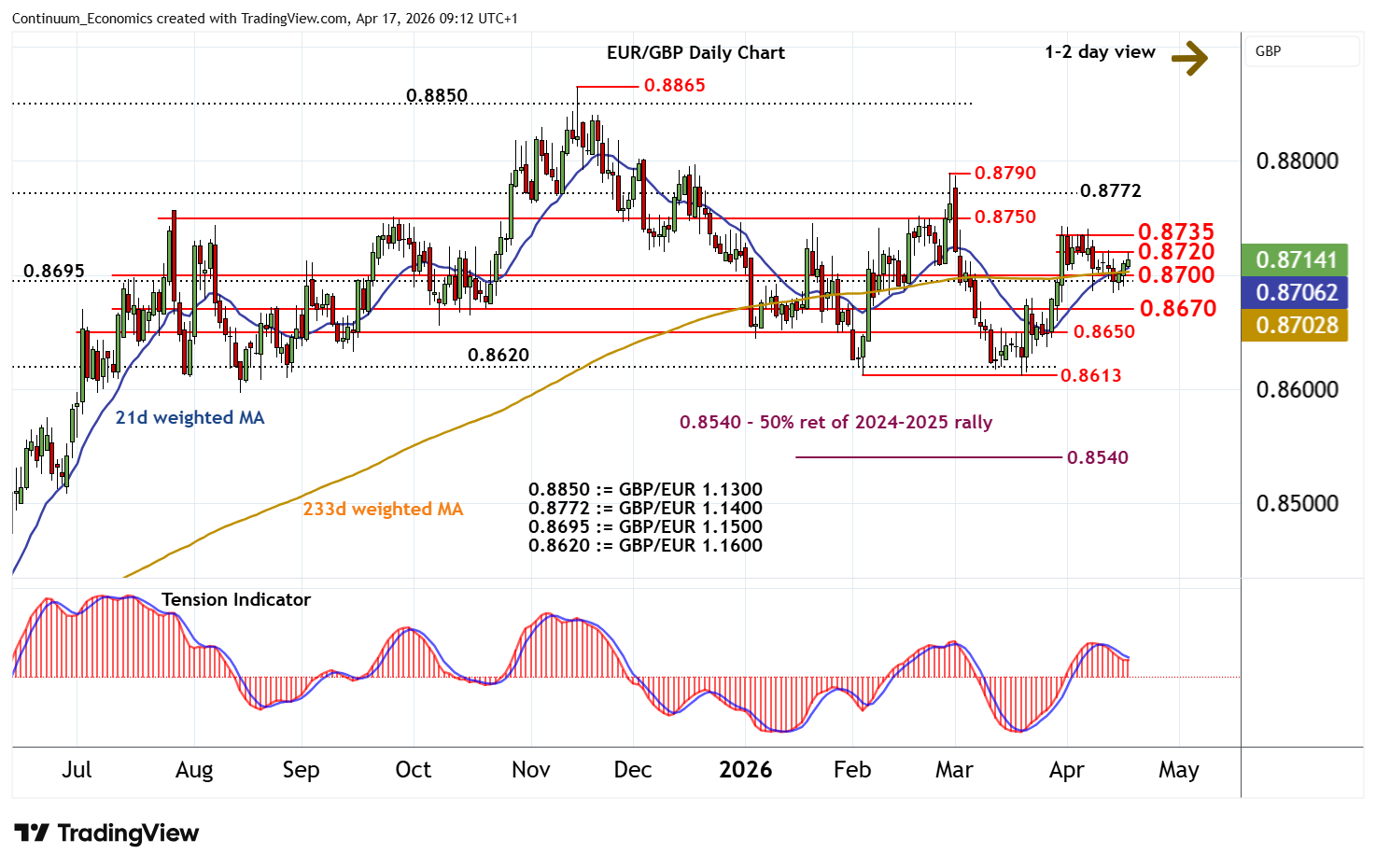 09:05 BST - Choppy trade around 0.8695/00 has given way to a test higher to resistance at 0.8720, where mixed intraday studies are prompting renewed selling interest. Bearish daily readings are flattening and broader weekly charts are rising, suggesting room for further strength in the coming sessions. But a close above the 0.8735 congestion highs is needed to improve price action and extend mid-March gains initially towards congestion around 0.8750. Meanwhile, a close below support at 0.8695/00, if seen, would add weight to sentiment and open up a test of congestion support at 0.8670.