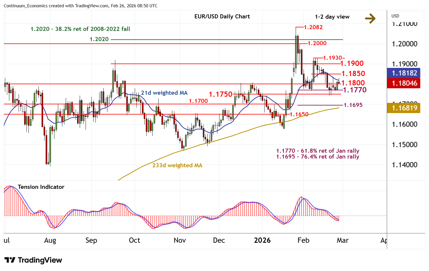08:40 GMT - Anticipated minor gains have met selling interest beneath the 1.1835 high of 23 February, as overbought intraday studies unwind, with prices currently pressuring congestion support at 1.1800. A break will open up the 1.1770 Fibonacci retracement. But rising daily readings are expected to limit any initial tests in consolidation, before negative weekly charts extend losses still further. A close below congestion support at 1.1750 will turn sentiment negative and confirm continuation of January losses, as focus then turns to strong support at the 1.1695 retracement and congestion around 1.1700. Oversold daily stochastics could limit any initial tests in short-covering/consolidation. Meanwhile, resistance at 1.1850 should cap any immediate tests higher.