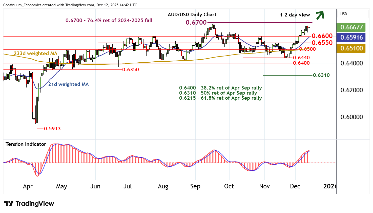 14:35 GMT - Little change, as mixed intraday studies keep near-tern sentiment cautious and extend consolidation beneath the 0.6685 high of 10 December. A tick higher in overbought daily stochastics highlights potential for a test of critical resistance at the 0.6700 Fibonacci retracement and the 0.6705 current year high of 17 September. But the flattening positive daily Tension Indicator is expected to limit any initial tests in consolidation, before rising weekly charts prompt a break. A close above here will improve sentiment and open up a test of critical resistance at 0.6700/05. Meanwhile, support remains down to congestion around 0.6600. A close beneath here would turn sentiment neutral and give way to consolidation above further congestion around 0.6550.