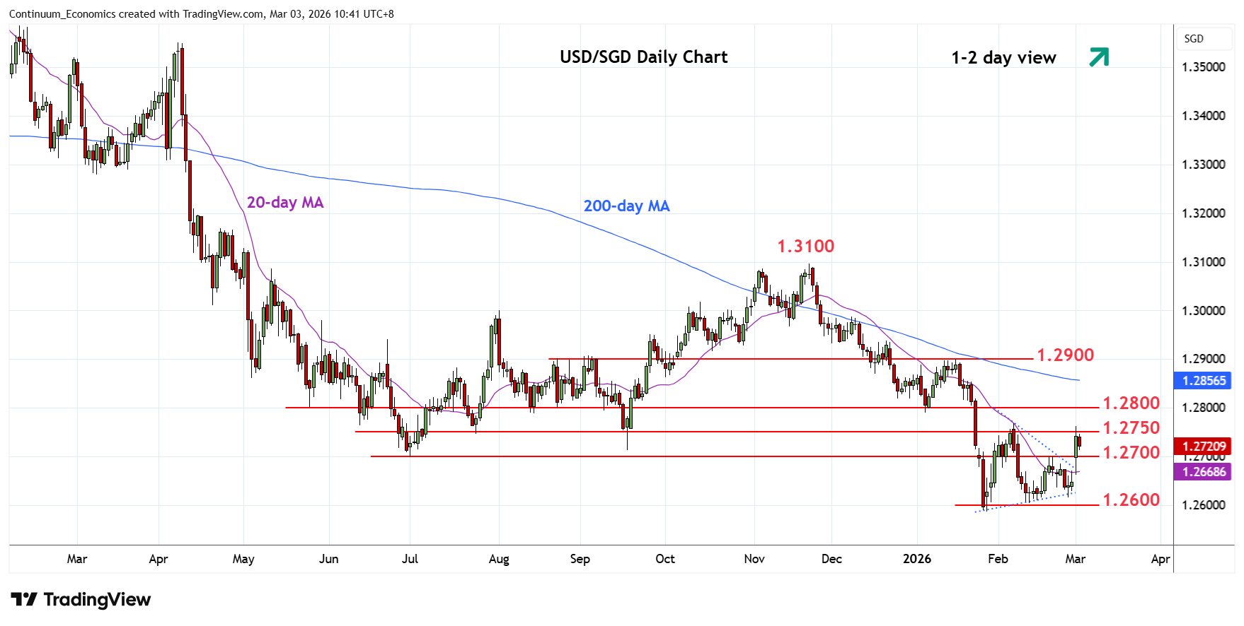 Settled back from test of resistance at the 1.2750/86 area to consolidate strong bounce from the 1.2615 low of last week