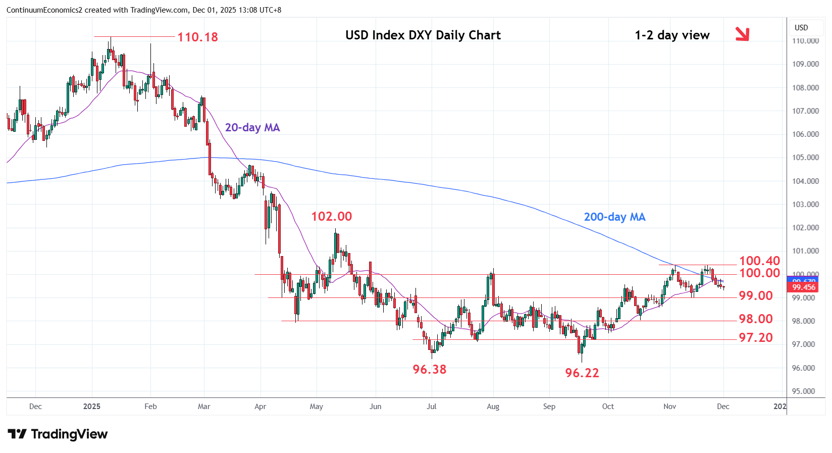 05:15 GMT - Under pressure as prices extend pullback from the 100.36/100.40, November highs. Daily studies continue to track lower and suggest room to extend losses towards support at the 99.00 congestion. Break here will confirm a double top at the 100.36/100.40 highs and further retrace gains from the 96.22, September YTD low. Lower will see potential to the 98.56 support then 98.00 April low and congestion area. Meanwhile, resistance at the 100.00 level is expected to cap and sustain losses from the 100.40 high.
