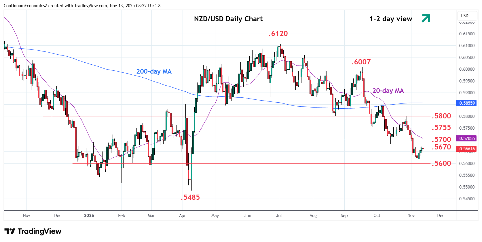 00:25 GMT - Pressure remains on the upside and break above the .5670 resistance will see room to extend gains from the .5606 low. Clearance will see room for extension to target the .5700 level. Break above the latter will open up room for stronger gains to retrace losses from the .6007 September high to resistance at .5755/.5800, September and August lows. Meanwhile, support at .5606/00 area should underpin. Only below here will further extend the July losses and see potential for retest of the .5485, April current year low.