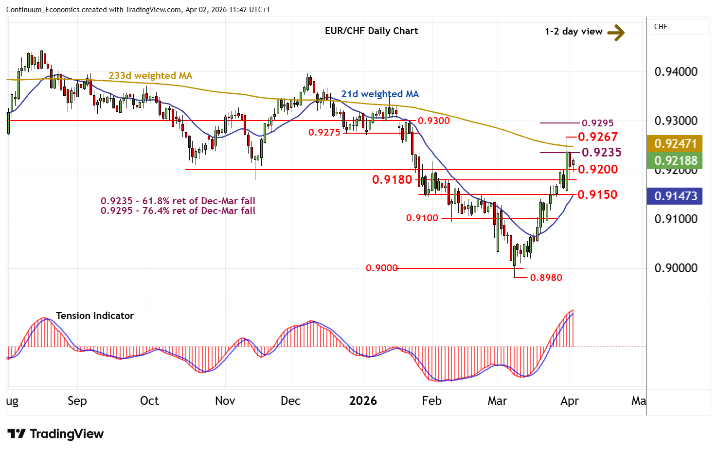 11:05 BST - The break below 0.9200 has bounced from congestion support at 0.9180, as intraday stochastics turn higher, with prices currently trading around 0.9220. Mixed daily readings are showing signs of improvement and broader weekly charts continue to rise, highlighting room for fresh gains in the coming sessions towards resistance at the 0.9235 Fibonacci retracement. A close above here is needed to improve sentiment and extend March gains beyond the 0.9267 monthly high of 31 March initially towards 0.9275. Meanwhile, support remains within 0.9180/00. A close beneath here, if seen, will open up support at the 0.9150 break level, where renewed buying interest is expected to appear.