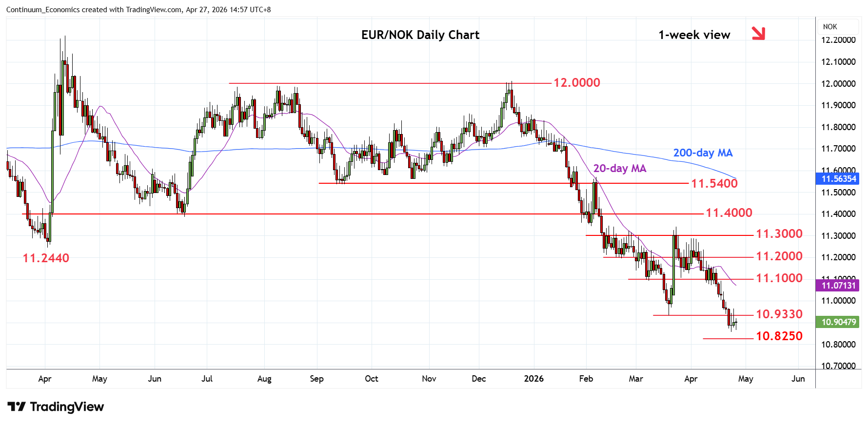 07:10 GMT - Edged up from the 10.8560 low of last week as prices consolidate losses from the 11.3400 March swing high. Daily studies are stretched and suggest scope for bounce to resistance at 10.9330 March low and 11.0000 figure. Above here will see room for stronger corrective bounce to strong resistance at 11.1000 congestion which is expected to cap. Meanwhile, break of the 10.8560 low will further extend broader losses from the April 2025 year high and see room to 10.8250, 50% Fibonacci retracement. Lower still will see room to 10.8000 and 10.7000 congestion area.