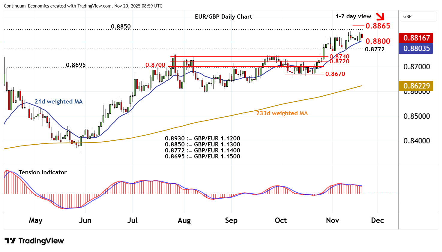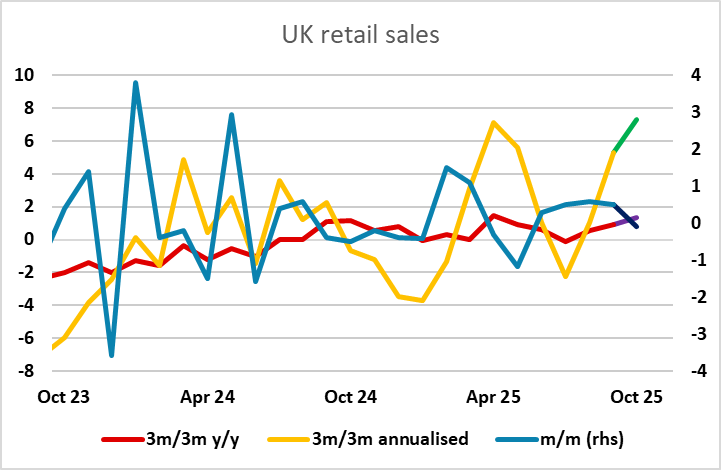 The risks may also be on the downside for UK retail sales which also look to be due a correction from recent strong numbers. While the underlying trend may be solid, the market consensus estimate of a 0.1% decline would put the 3 month annualised trend above 5%, which looks a little out of line with the general tone we are seeing from the UK data. Risks for GBP may therefore be on the downside, but EUR/GBP still looks well capped at 0.8850 near term, so only a modest foray above 0.88 seems possible.