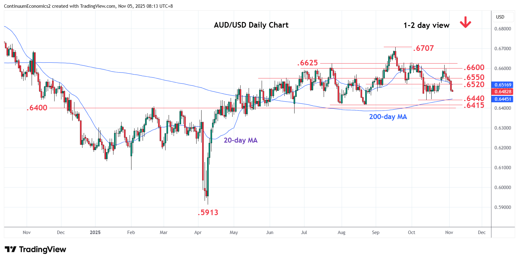 00:15 GMT - Prices remain under pressure with break of support at the .6520/00 area seeing extension to reach support at the .6480/70 congestive lows. Consolidation here see prices unwinding oversold intraday studies but negative daily studies suggest this giving way to further losses later. Lower will see room to the critical .6440/.6415, October and August lows. Meanwhile, resistance is lowered to the .6520 low of 26 September and extending to .6550 congestion, now expected to cap and sustain losses from the .6600/25 resistance.