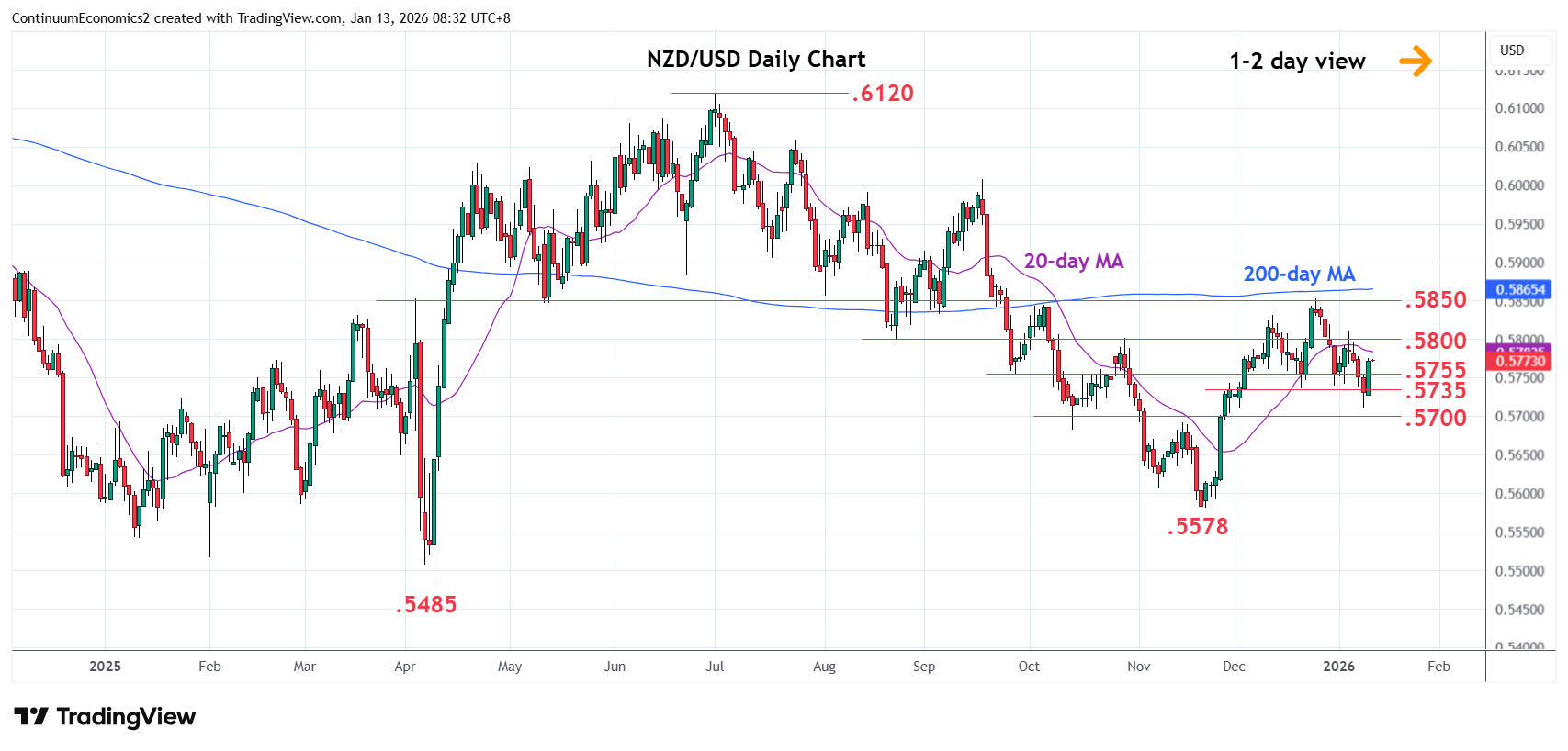 00:35 GMT - Turned up from from strong support at the .5715/00 area as prices unwind oversold intraday and daily studies and consolidate losses from the .5850 December high. Break above resistance at the .5755 congestion see room for stronger gains to the .5800 level which is expected to cap. Would need to regain the latter to clear the way for retest of resistance at .5830/.5850 area and extend the broader gains from .5578 November low to retrace losses from the .6120, July 2025 year high. Meanwhile, support is raised to .5735 which extend to the .5715/00 area, now seen protecting the downside.