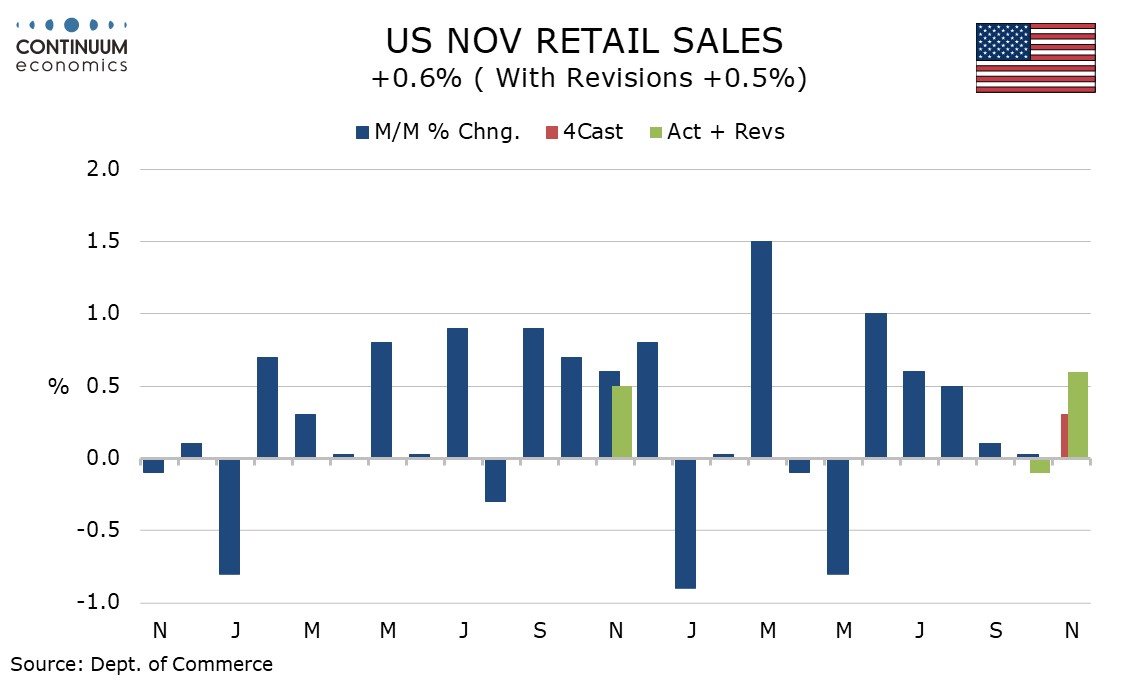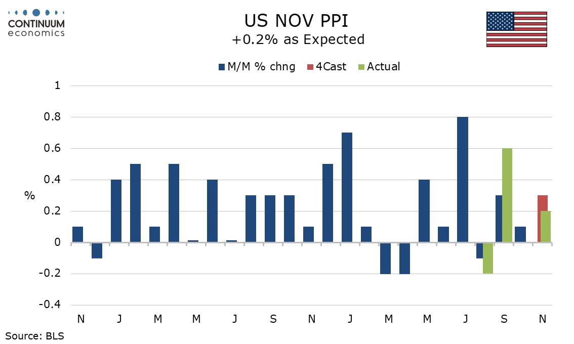 November retail sales with a rise of 0.6% are marginally stronger than expected but the data is close to expectations net of modest negative back month revisions. PPI has been released for both October and November, also net in line with expectations, with October on the firm side in the core rate followed by a more subdued November.