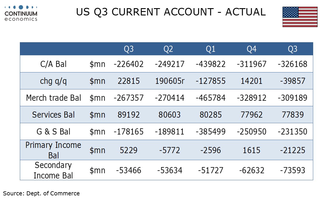Q3’s current account deficit of $226.4bn from $249.2bn in Q2 was the narrowest since Q3 2022. Improvements in the goods and services balances were already known. Additional support came from a return to surplus in the investment income balance at $5.2bn versus a $5.8bn deficit in Q2.