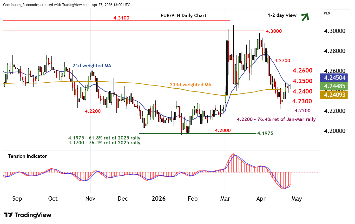 12:50 BST - The anticipated test of congestion resistance at 4.2500 has given way to a pullback and renewed consolidation within the 4.2400 - 4.2500 range. Daily stochastics and the daily Tension Indicator continue to rise, highlighting room for a retest above 4.2500 towards further congestion around 4.2600. But negative weekly charts should prompt renewed selling interest towards here. Meanwhile, a close below 4.2400 would open up 4.2300. However, a further close below 4.2200 is needed to turn sentiment negative and extend March losses towards support within the 4.1975 - 4.2000 range.