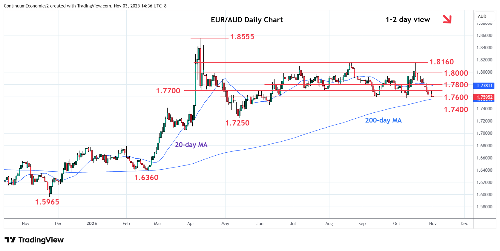 07:15 GMT - Extending consolidation above the 1.7600/1.7570 September/October range lows as prices unwind oversold daily studies. However, pressure remains on the downside and break here will confirm a double top at the August/October highs and open up room for deeper pullback to retrace gains from the May low. Lower will see room to support at the 1.7500/1.7460, congestion and June low, and the 1.7400 level. Meanwhile, resistance at the 1.7700/1.7800 congestion area is expected to cap and sustain losses from 1.8160 high.