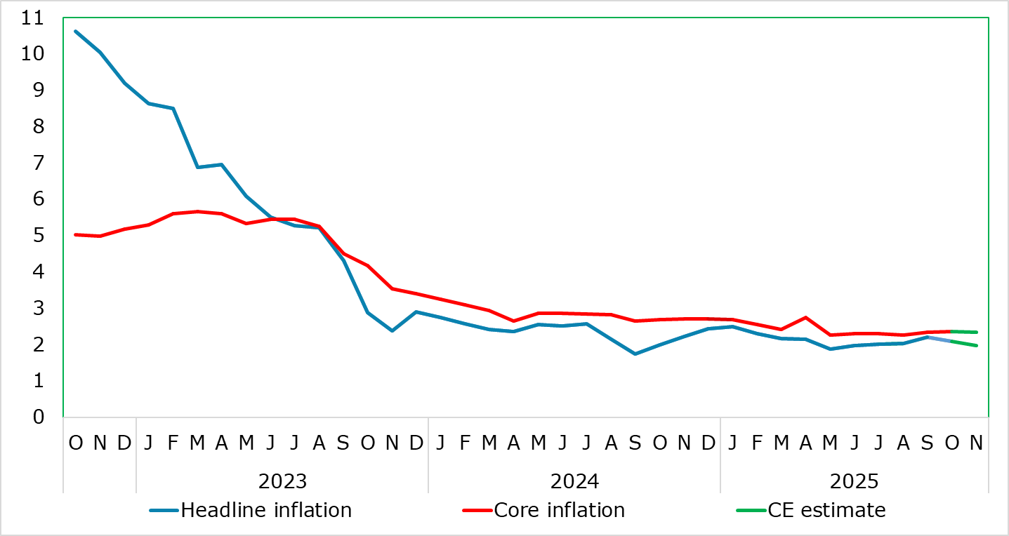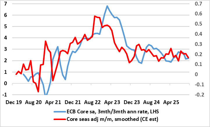 This near-term outlook is actually shared by the ECB, which envisages headline HICP moving below and then staying below 2% target until H2 2027 but that the underlying rate (ex energy tariffs) nestling around 1.8%. Despite this benign outlook, the last Council meeting saw a clear(er) debate about the inflation outlook, where to many members the inflation outlook had softened slightly, because headline HICP is now seen undershooting the target not only in 2026 but also in 2027, and by an even wider margin when accounting for the upward effect on inflation from the introduction of the likely widening of the EU Emissions Trading System in 2027, the so-called ETS2.