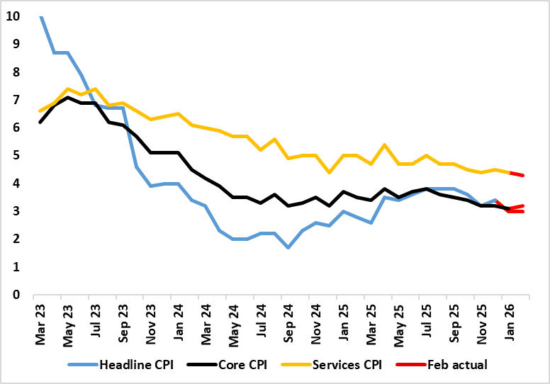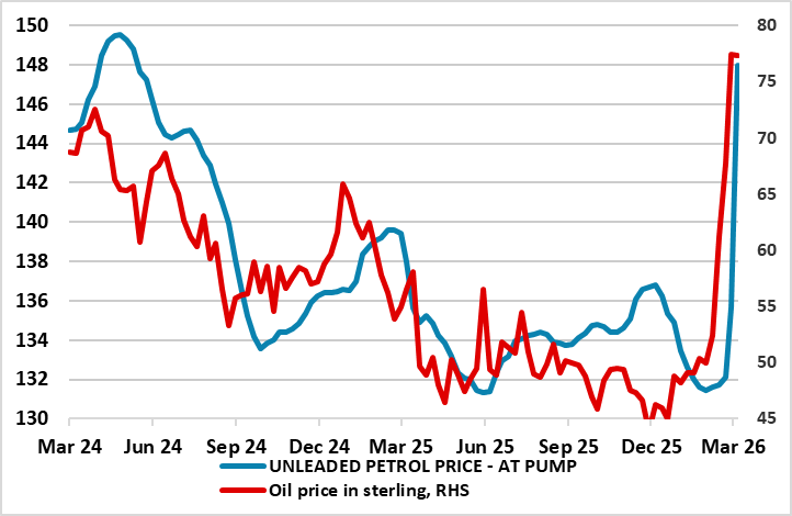 After January’s clear fall, even in the core rate, where the headline CPI rate fell from December’s 3.4% to 3.0% (a 10-mth low) it stayed there in February’s numbers – matching both consensus and BoE projections. Services fell 0.1 ppt to 4.3% which was a four-year low (Figure 1) but the core edged back up a notch due to higher non-energy good inflation. They were offset by slightly lower fuel prices, hardly a foretaste of what is to come in coming months as the Middle East conflict spills over with petrol prices as they were by mid-March likely to add 0.3 ppt the headline rate (Figure 2). On the basis of our baseline 4-8 week war thinking, we see the headline CPI up to 3.5% in March but then falling back for a while before moving back to 3% in Q4 but then dropping back through 2027 to average 2.1%.