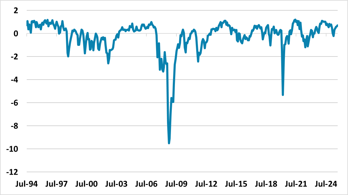 This is why forward guidance has helped to guide multi month policy rate expectations, as it provides a short cut for big picture guidance on policy rates. The U.S. money market is now discounting a move toward the median FOMC neutral policy rate of 3.0% by end 2026 (Figure 1). However, the use of forward guidance can dampen interest rate expectations as the policy cycle become more mature. For example though we look for a 3.00-3.25% Fed Funds rate by end 2026 (here), the alternative scenario of a hard landing for the economy would likely see the Fed easing to 2.00-2.50% terminal policy rate. FOMC members estimates of the neutral long-term policy rate also varied between 2.60-3.90% at the September FOMC meeting and low immigration could mean that the neutral policy rate drifts a little higher in 2027-28. Some clients ask us whether one single measure can help provide a guide to future policy prospects such as financial conditions index. However, U.S. financial conditions (Figure 2) are currently lax due to the overvalued equity market, which could tighten again with an April style fall in the equity market. Money supply is useful (Figure 3), but our overall approach remains a comprehensive review of current economic and financial conditions and our view of how they will evolve in the next 3-24 months.