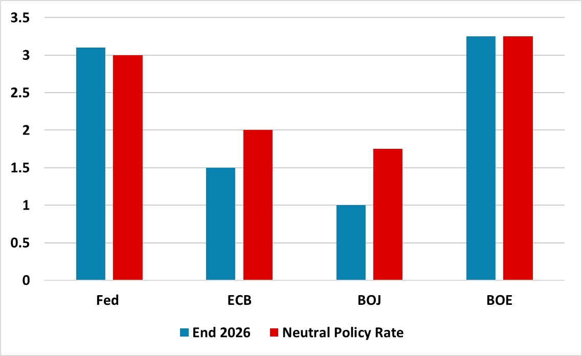 · Neutral policy rate estimates and forward guidance provide some help at the start of easing cycles, but less so at mid to mature stages. For the Fed, ECB and BOE we look at a wider array of economic and financial conditions, alongside our own projections over the next 2 years to make forecasts for the policy rate trajectory and terminal policy rate. We feel that the ECB and BOE will deliver more easing than guided by policymakers and discounted in markets, as a reassessment occurs into 2026 of the disinflation process – market expectations for the Fed are about right, though we look for a Q1 pause (here). For the BOJ, we see two 25bps hikes coming quicker than BOJ forward guidance or current expectations.