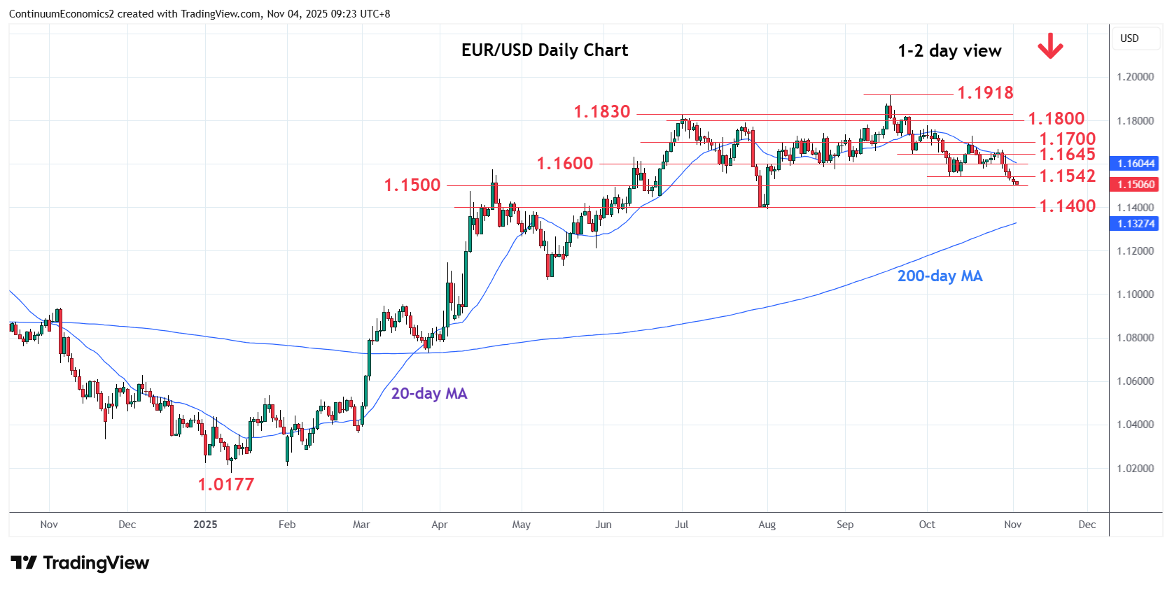 01:25 GMT - Prices remain under pressure and break of the 1.1542 support see the 1.1500 level now at risk as prices extend the broader losses from the 1.1918, September current year high. Lower will see scope to 1.1450 but focus will turn to the strong support at 1.1400, July/August lows. Meanwhile, resistance is lowered to the 9 October low at 1.1542, now expected to cap. Regaining this will open up room for retest of strong resistance at 1.1600/1.1645 congestion area. Regaining this needed to fade the downside pressure and open up room for stronger recovery to retrace losses from the September high.