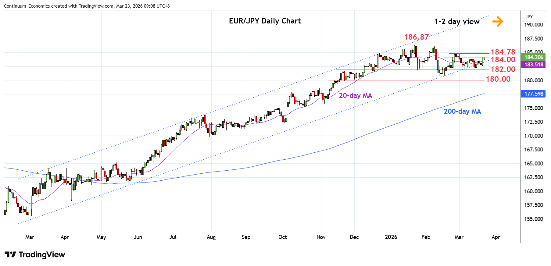 01:10 GMT - Higher in choppy trade to regain the 184.00 level following bounce from the 182.00 level. Above the 184.25 high will see room for retest of resistance at 184.78 high of 25 February. Gains beyond this, if seen, likely to be limited and give way to selling pressure below the 186.00/22 resistance. Meanwhile, support is raised to the 183.00/182.00 congestion area which should underpin. Break here needed to return focus to the downside for retest of the 180.80, 12 February current year low.