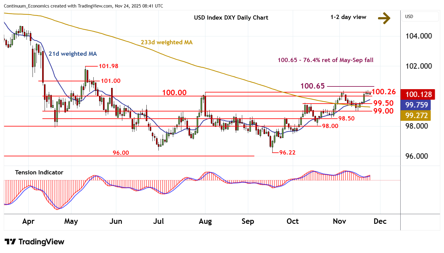 08:35 GMT - Still little change, as prices extend cautious trade within strong resistance at congestion around 100.00 and the 100.26 monthly high of 1 August. Intraday studies are under pressure and rising daily stochastics are flattening, highlighting room for a break back below 100.00. But the positive daily Tension Indicator should limit scope in renewed consolidation/buying interest above support at the 99.50 break level. Following cautious trade, fresh gains are looked for. A break above 100.00/26 will improve sentiment and extend mid-September gains towards the 100.65 Fibonacci retracement, where mixed weekly charts could prompt fresh selling interest/consolidation.